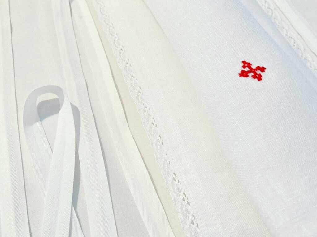 In this class, we will construct one Amice, using pure, prepared linen and learn the traditional method of pulling threads for accuracy and treatment of the grain of the cloth. Likewise, blocking, hemming and embroidering the red 20-stitch counted cross-stitch center back Cross will be included as each student crafts their own Amice. Cleaning and caring for the finished sacred linen will be covered as well as treatment for prepping unprepared linen for future tailoring projects.